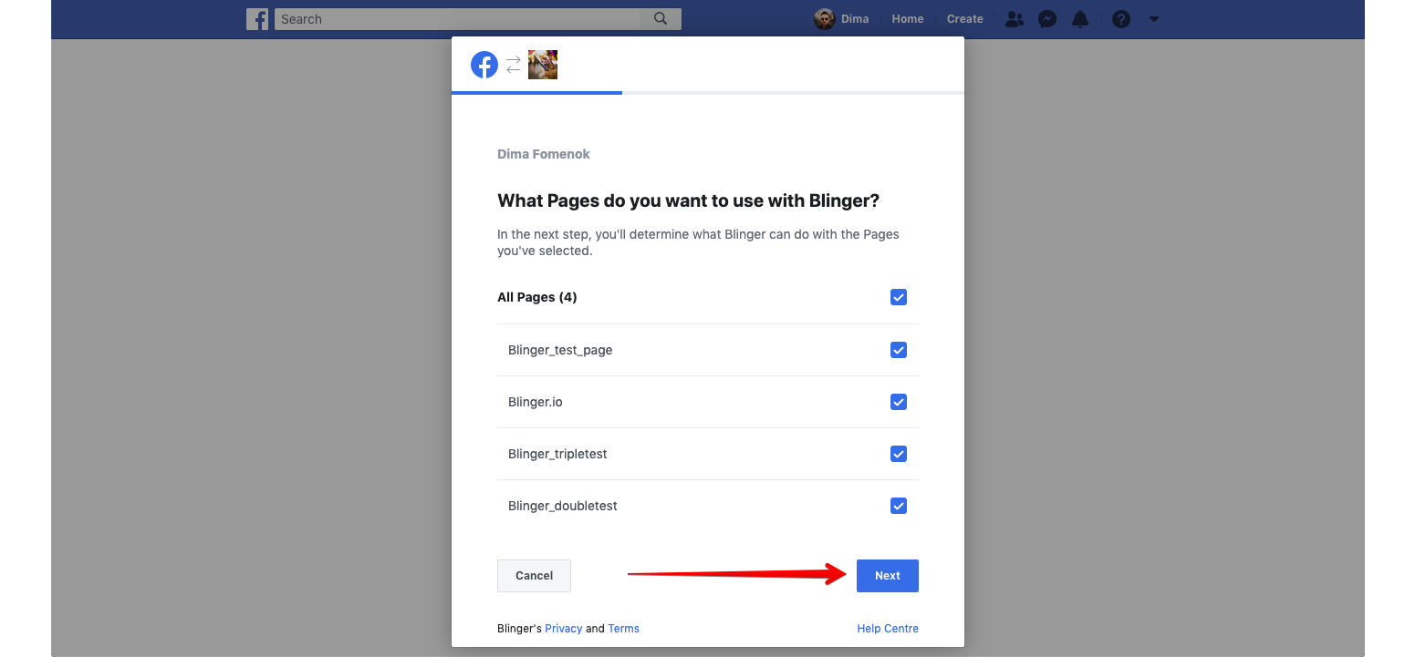 After clicking "Start" you will be automatically redirected to the Facebook page, where it is necessary to **allow access for the Blinger.io application**, to be able to search for the "Pages", which you can manage.